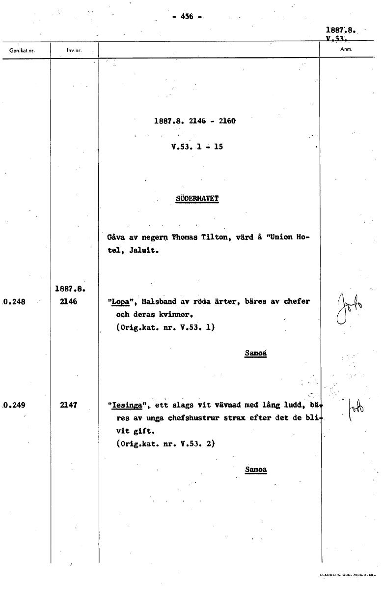 • - 456 - 188713. v 51' 1887.8. 2146 2160 V.53..1 15 SÖDERHAVET Gåva av negern Thomas 'filton, värd å "Union Ho- tel, Jaluit. 1887.8. 0.248 2146 "Lisma", Halsband av åda ärter, bäres av chefer och deras... Visa hela