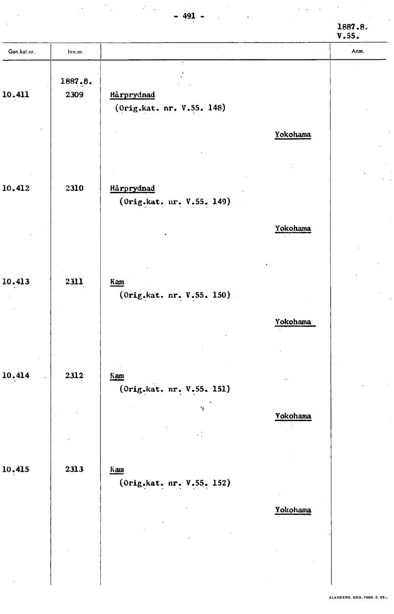 • -491- 1887.8, V.55. 1887.8. 10.411 2309 Hårprydnad (Orig.kat. nr. V.55. 148) Yokohama 10.412 2310 Hårprydnad (Orig.kat. nr. V.55. 149) Yokohama 10.413 2311 Kam (Orig.kat. nr. V.55. 150) Yokohama 10.41... Visa hela