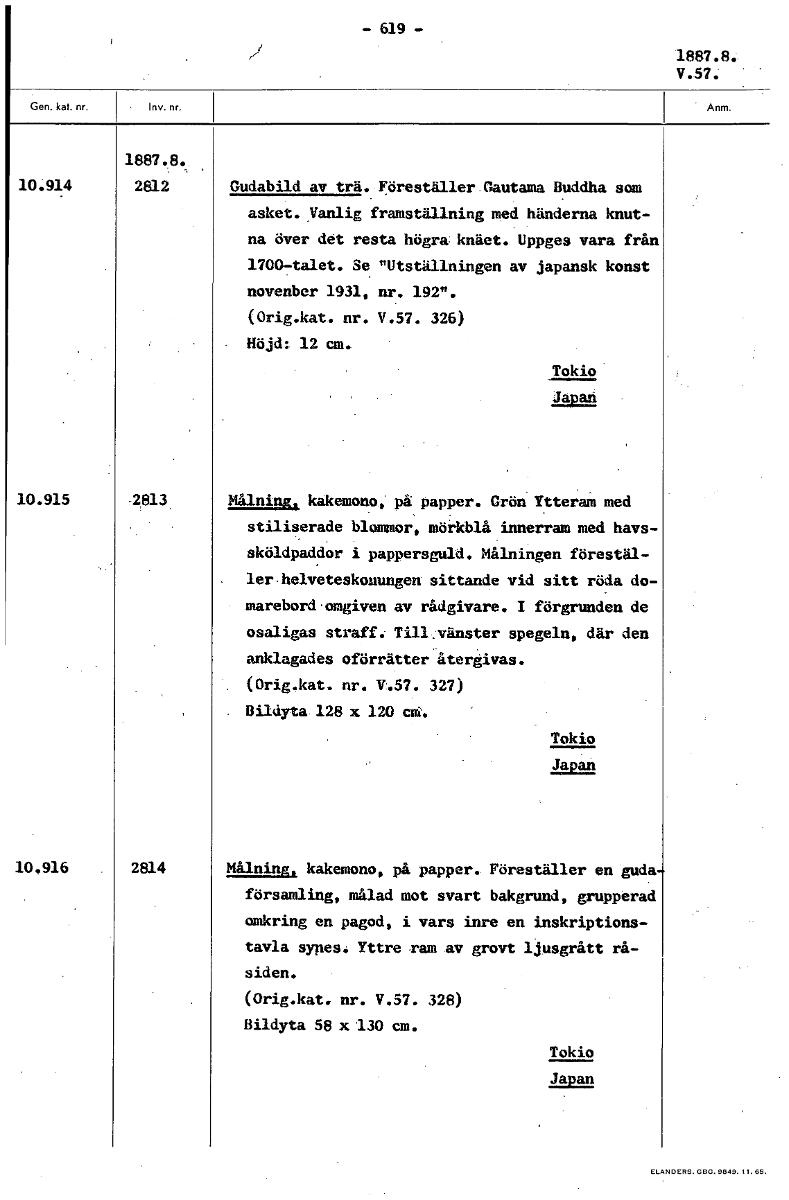 -619- V.5n 1887.8. 10.914 2812 Gudabild av trä. Föreställer Gautama Buddha som asket. Vanlig framställning med händerna knut- na över det resta högra knäet. Uppges vara från 1700-talet. Se "Utställningen av japansk konst november 1931, nr. 192". (Orig.kat. nr. V.57. 326) Höjd: 12 cm. Tokio Japan 10.915 2813 Målning, kakemono, på papper. Grön Ytteram med stiliserade blommor, mörkblå innerram med havs- sköldpaddor i pappersguld. Målningen förestäl- ler•helveteskouungen sittande vid sitt röda do- marebord omgiven av rådgivare. I förgrunden de osaligas straff. Tillvänster spegeln, där den anklagades oförrätter återgivas. (Orig.kat. nr. V.57. 327) Bildyta 128 x 120 crii. Tokio Japan 10.916 2814 Målning, kakemono, på papper. Föreställer en goda församling, målad mot svart bakgrund, grupperad omkring en pagod, i vars inre en inskriptions- tavla synes. Yttre ram av grovt ljusgrått rå- siden. (Orig.kat. nr. V.57. 328) Bildyta 58 x '130 cm. Tokio Japan [ocr]