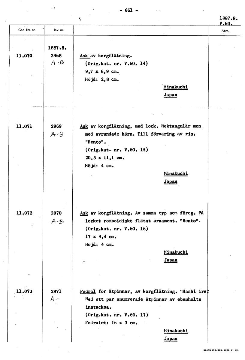 -661- 1887.8. V.60. 1887.8. 11.070 2968 Ask av korgflätning. - 12> (Orig.kat. nr. V.60. 14) 9,7 x 6,9 cm. Höjd: 2,8 cm. Minakuchi Japan 11.071 2969 Ask av korgflätning, med lock. Rektangulär men A- me...