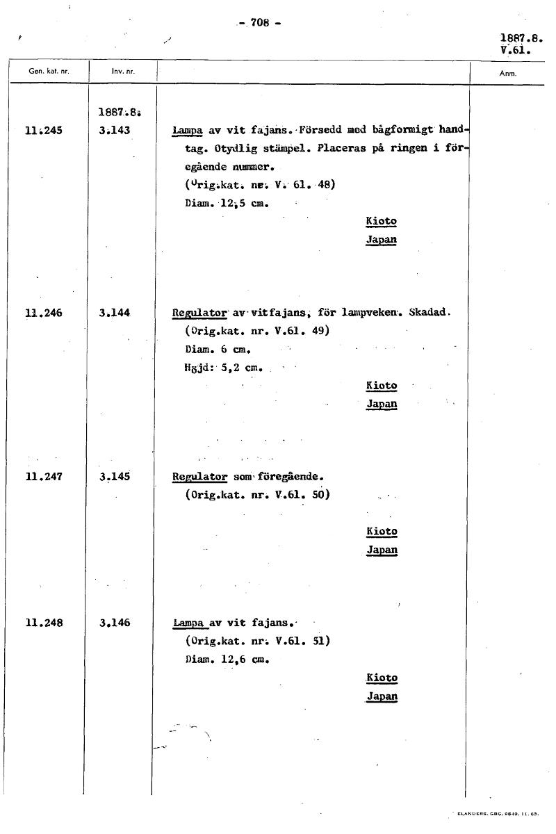 .-,708 - 1887.8. V:61. 1887:81 11.245 3.143 Lampa av vit fajans.. Försedd eled bågformigt hand tag. Otydlig stämpel. Placeras på ringen i för egående nummer. (uriglkat. nel V. 61. 48) Diam. 12,5 cm. Kioto Japan 11.246 3.4144 Regulator awvitfajans, för lampveken. Skadad. (Orig.kat. nr. V.61. 49) Diam. 6 cm. Höjd: 5,2 cm. Kioto Japan 11.247 3.145 Regulator som föregående. (Orig.kat. nr. V.61. 50) Kioto Japan 11.248 3.146 Lampa av vit fajans.- (Orig.kat. nr: V.61. 51) Diam. 12.6 cm. Kioto Japan [ocr]Stäng