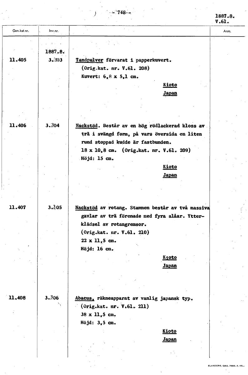 1887.8. V.61. 1887.8. 11.405 3.333 Tandpulver förvarat i papperkuvert. (Orig.kat. nr. V.61. 208) Kuvert: 6.8 x 5,1 cm. Kioto Japan 11.406 3.304 Nackstöd. Består av en hög rödlackerad kloss av trä .i svängd fonn, på vars översida en liten rund stoppad kudde är fastbunden. 18 x 10,8 cm. (Orig.kat. nr. V.61. 209) Höjd: 15 cm. Kioto Japan 11.407 3.05 Nackstöd av rotang. Stammen består av två massiv gavlar av trä förenade med fyra slåar. Ytter- klädsel av rotangremsor. (Orig.kat. nr. V.61. 210) 22 x 11,5 cm. Höjd: 16 cm. Kioto Japan 11,408 3.3.06 Abacus, räkneapparat av vanlig japansk typ. (Orig.kat.. nr. V.61. 211) 38 x 11,5 cm. Höjd: 3,5 cm. Kioto Japan [ocr]