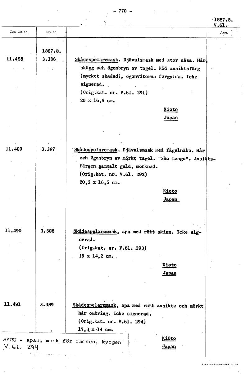 -770- 1887.8. V.61. 1887.8. 11.488 3.386, , Skådespelaremask. Djävulsmask med stor näsa. Hår skägg och ögonbryn av tagel. Röd ansiktsfärg (mycket skadad), ögonvitorna förgylda. Icke signerad. (Orig.kat. nr. V.61. 291) 20 x 16,5 cm. Kioto Japan 11.489 3.387 Skådespelaremask..Pjävulsmask med fågelnäbb. Hår och ögonbryn av mörkt tagel. "Sho teragu". Ans' ts- färgen.gammalt guld, mörknad. (Orig.kat. nr. V.61. 292) 20,5 x 16,5 cm. Kioto Japan 11.490 3.388 Skådespelaremask, apa med rött skinn. Icke sig- nerad. (Orig.kat. nr. V.61. 293) 19 x 14,2 cm. Kioto Japan 11.491 3.389 Skådespelaremask, apa med rött ansikte och mörkt hår omkring. Icke signerad. (Orig.kat. nr. V.61. 294) 17,3_X,14 cm: KiOto SARU - apan, mask för far sen, kyogen 61. 299 ,Japan [ocr]