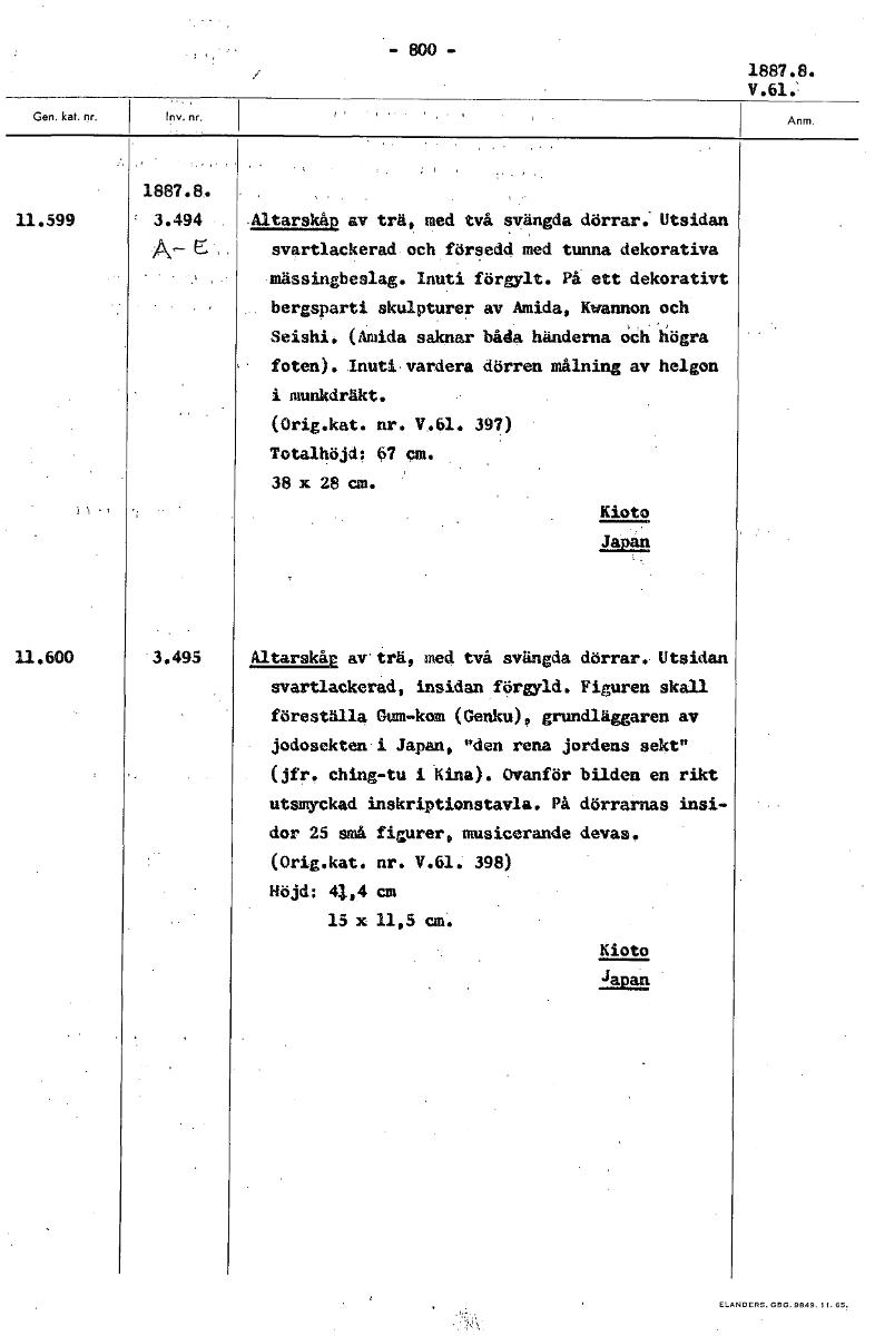 -800- 1887.8. V.61; 1887.8. 11.599 ' 3.494 Altarskåp av trä, med två svängda dörrar; Utsidan svartlackerad och försedd med tunna dekorativa mässingbeslag. Inuti förgylt. På ett dekorativt bergsparti skulpturer av Amida, Kwannon och Seishi. (Amida saknar båda händerna Och högra foten). Inuti vardera dörren målning av helgon i munkdräkt. (Orig.kat. nr. V.61. 397) Totalköjd: 67 cm. 38 x 28 cm. Kioto Japan 11.600 3.495 Altarskår av trä, med två svängda dörrar. Utsidan svartlackerad, insidan förgyld. Figuren skall föreställa Gum-kom (Genku), grundläggaren av jodosekten i Japan, "den rena jordens sekt" (jfr. ching-tu i Kina). Ovanför bilden en rikt utsmyckad inskriptionstavla. På dörrarnas insi- dor 25 små figurer, musicerande devas. (Orig.kat. nr. V.61. 398) Höjd; 41,4 cm 15 x 11,5 cm. Kioto Japan [ocr]