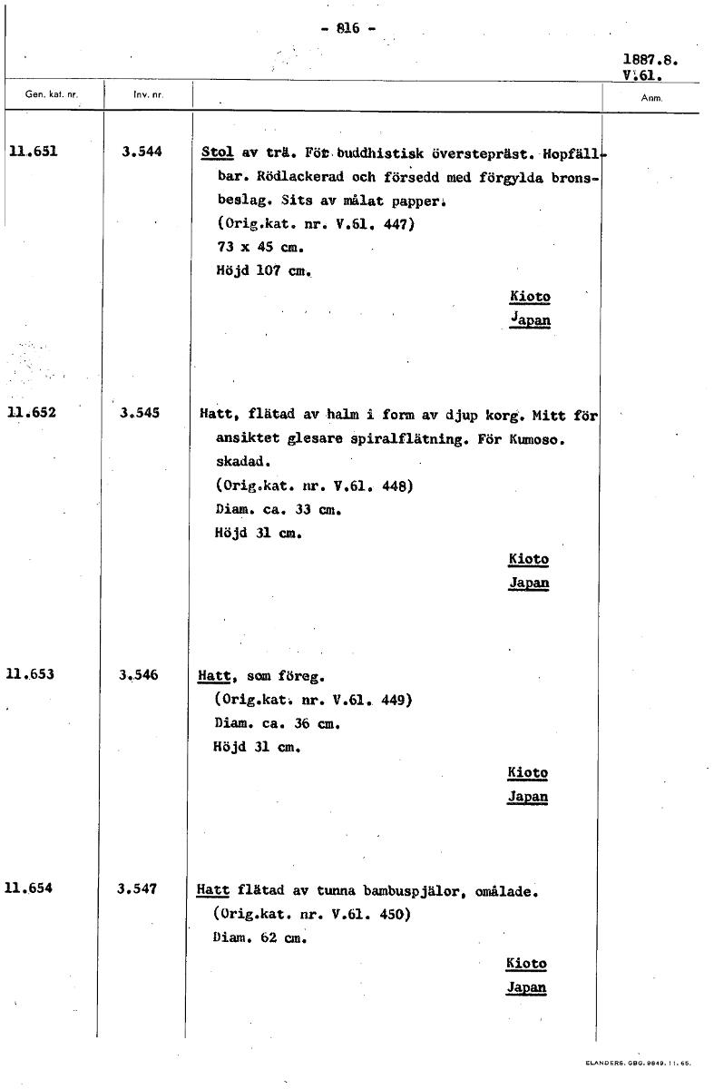 - 816 - 1887.8. VAL 11.651 3.544 Stol av trä. För buddhistisk överstepräst. Hopfäll bar. Rödlackerad och försedd med förgylda bronsbeslag. Sits av målat papper. (Orig.kat. nr. V.61. 447) 73 x 45 cm. Höjd 107 cm. Kioto 'Japan 11.652 3.545 Hatt, flätad av halm i form av djup korg. Mitt för ansiktet glesare spiralflätning. För Kumoso. skadad. (Orig.kat. nr. V.61. 448) Diam. ca. 33 cm. Höjd 31 cm. Kioto Japan 11.653 3,346 Hatt, som föreg. (Orig.kat. nr. V.61. 449) Diam. ca. 36 cm. Höjd 31 cm. Kioto Japan 11.654 3.547 Hatt flätad av tunna bambuspjälor, omålade. (Orig.kat. nr. V.61. 450) Diam. 62 cm. Kioto Japan [ocr]Stäng