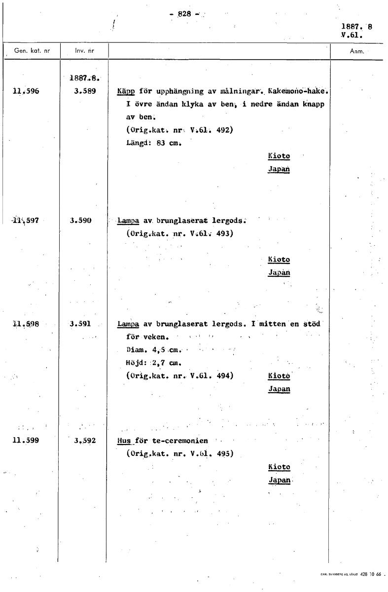 - 828 1887..8 V.61. 1887.1L' 11.596 1887.1L'3.589 Käpp för upphängning av målningar. Kakemond-hake. 1 övre ändan klyka av ben, i nedre ändan knapp av ben. (Orig.kat. nr, V.61. 492) Längd: 83 cm. Kioto Japan 1.k.597 3.590 Lampa av brunglaserat lergods:' (Orig:kat. nr. V.61. 493) Kioto Jagan 11.598 3.591 Lampa av brunglaserat lergods. I mitten en stöd för veken. Diam. 4,5 cm. Höjd: 2,7 cm. (Orig.kat. nr. V.61. 494) Kioto Japan 11.599 • 3.592 Hus för te-ceremonien (Orig.kat. nr. Viii. 493) Kioto Japan. [ocr]Stäng