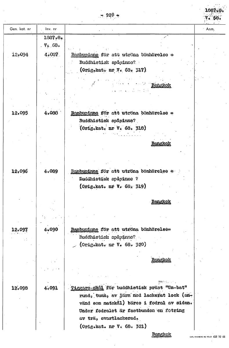 1887 e>" 92P •i• 68. 1887y8 12094 449P1.. 231212~:1 fök at utröna bönhörelse • Buddhistisk spåpinne? (04;g4kati. nry. 68. 317) 12.095. 4.4289 Itåtabt~ för att utröna bönhörelse Buddhiatisk sphinns? (Orig4kat4 nr V. 68. 318) 12.096 4.089 B°:411~ för att utröna bönhörelse Buddhitg4sk spapinne ? (.Qrigkkat4, nr V. 6: Bangkok 12..097 4. 090' Bambuoinne för ätt utröna bönhörelse= Buddhistisk opåp~? (0rig4kat. nr V. 68. 320) Bangkok , . 12'6098 4;091 Ti för buddhistisk präst "Um-bat" zund2 tunn av järn' mod lackerat lock vänd som matokål) bäres i fodral av siden. Under fodralet är fastbunden .en fotring av träs) svartlackerad4 (Origeket. nr V. 68. 321) Bangkok [ocr]Stäng