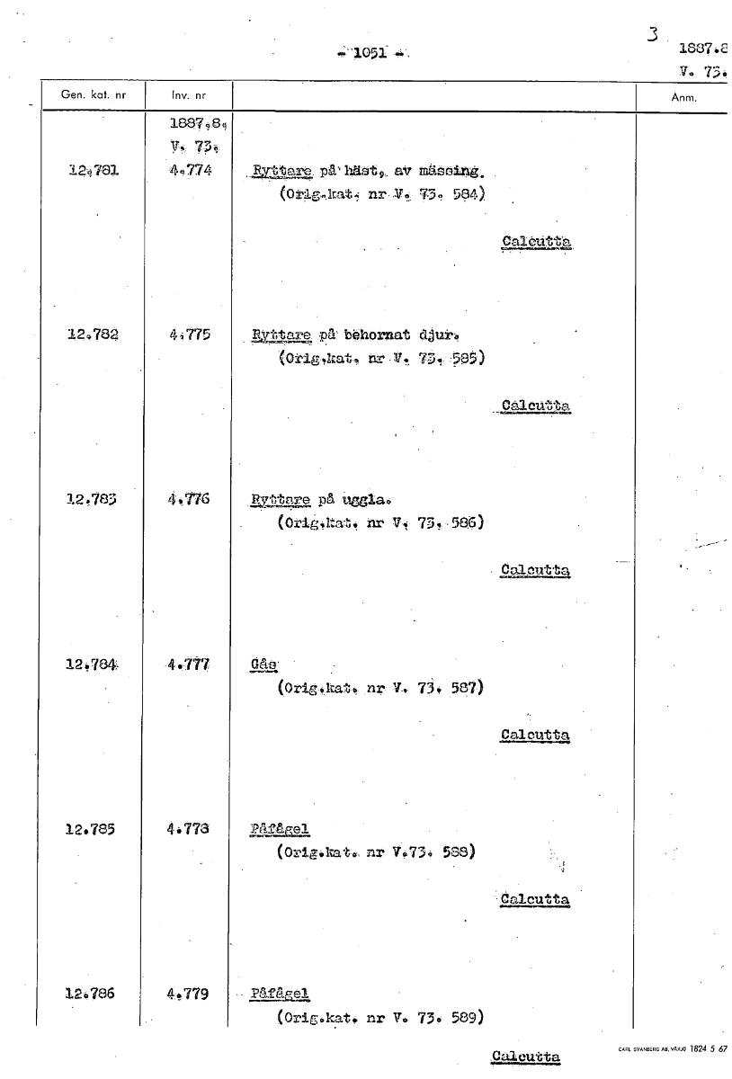-;-1051 1837.2 V. 73. 1867,8. IN 73,1, 12781 4.774 ttare på4hästp,atr mäsoing. nr,,V. 73. 584) CalCUtta 12-782 4in5 192/9.re lAbbhornat djur. (Okle,kat nr V. 73.595) Calcutta 12783 4.776 Ryttare på uggla. (Orlg,hat. nr V. 73..586) Calcutta 12.764, 4.777 Gåo. (Orig.kat. nr V. 75, 587) Calcutta 12.785 4.773 (Orig.kat., nr V.73. 588) Calcutta 12.786 4.779 Pafkl.9.1 (Orig.kat. nr V. 73. 589) Calcutta [ocr]