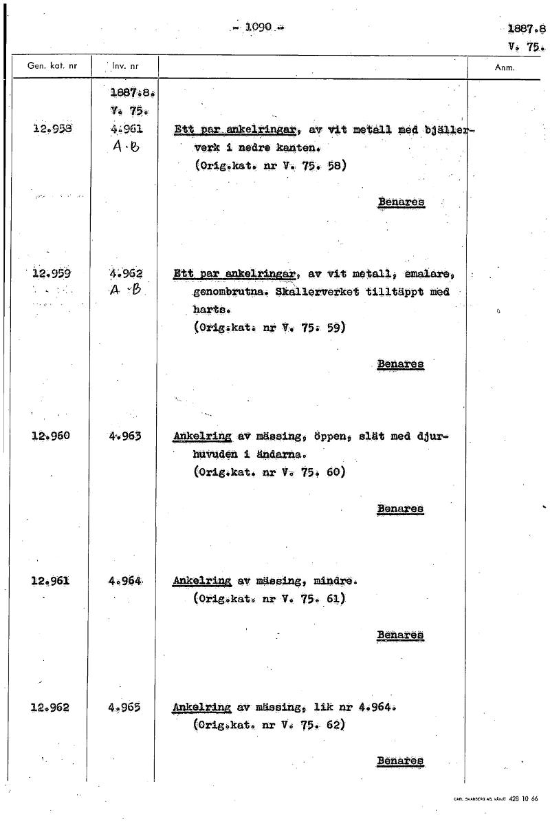 -106740 V. 75,, 12.95S Ett par..ankelrinPtat, av Vit metall med bjälle verk i nedre kanten. (Orig+kato nr V'4. 750 58) Benares '4962 Ett par ankelringar, av vit mstalip Smalare, Zenombrutna4 Skallsrverket tilltäppt med kinrts4 (0rig+kat+ nr IN 75+ 59) Botiatt3 12.960 45,963 Ankelrizg av mässing, dppenp slät med djur- gen i älgarna. (Orig.kat. nr V-4' 75+ 60) Benares 12,961 4.964 Ankelrinf av mässing, mindre+ (Orlg4kat4 nr V. 75+61) BenareM 120962 4.4965 Ankelring av mäsSingp lik nr 44964+ (0rigokat4 nr Vä 754 62) Benatem„ [ocr]