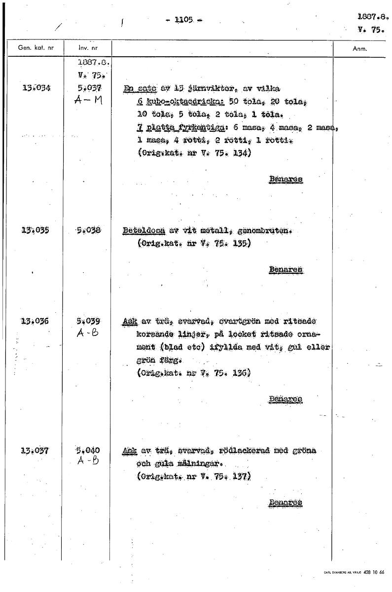 U05 1807.8. 11. 75o ve 75. 13;034 5.!,037 !n, rataF 13 ~ter, av vilka M Isulo--0AaesiriOca: 59 telag 20 tolap 10to1at 5 Ullas, 2 tö, tele,. zlatta fzirkeittUe: 6 mazik 4 masao. 2 mas 1 mola, 4 töttiv g töttiv, 1 itttie: (Origwkat. gr V. 75. 134) etret-åre 13'4035 peteldeoe, a-,4.1; =tant genombruten. (Orig.kat. nr Y.' 75. 135) 13.036 54039 a trä4 evartatli? Ovartgrön med rlteade A -e7 korsande 11.njety på 1ocket rlteade orna- ment (blad etc) 4y134o. med vite OU eller 004 (ori .kat.nr YR 75 130 13.037 3e040 av tigo åtrozito>49 epaseköziediie4gröna• Å -6 0022 gula tåln~år. (Orlekkat.: gr V. 734 137) [ocr]