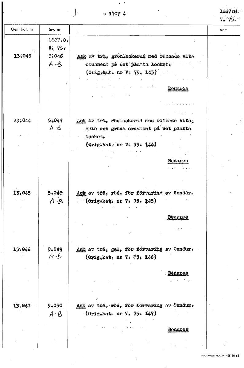 1107 4 1667.8. 75 15'443 046 Ask.av trä, grönlaekerad ned ritoade vita A -6 ornament p& det Platta locket* (Orig4ket4 er‘V4 75. 13444 5.047 Ask av trät rödlapkerad med ritade vita, A -g gula Och glidna ornament på det platta loökot.e (Oris4kate.nr Ve 75e 144) Benares 13445 5'0048 Ask av trä, röd, för förvaring av SendUre (orig.4ket4 'er V 75. 145) Benares 13.046 50249 Ask av trät 049 för förvarieg av'Senduri A - ,tOrigekate nr V 75e 146) !enare 15.047 5.050 Ask av trä0-röd, för förvaring av Sondur. A -6 (Origtkato nr Ve. 75. 147) BenateS [ocr]Stäng