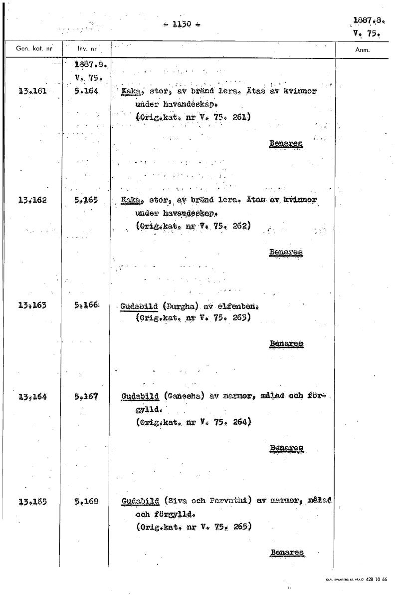 113Q ... 18874 V. 759. 18876%. V.: 759 13.161 5.164 Kaka; stot, av bränd lera. tasav kvinnor uhder havandeskapk 40rigOkat¥ nr V. 75. 261) Benares 13.162 50 65 Mao storg:a, bränd lerac Ätas, av 10innor...