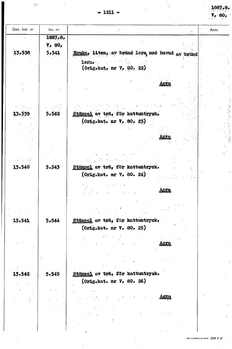 1211 V. 80. V. 80. 134 5+541 Houka, litens av :bränd ,1e*' med huvud: atr (Ortgokato nr V, f09 22> 5,542 8täitne1,.aV trät: för kattnntryeko. (Ori.g.ke.t. nr V.. 80, 23) 13.540 5.543 Stämpel av , trä,...