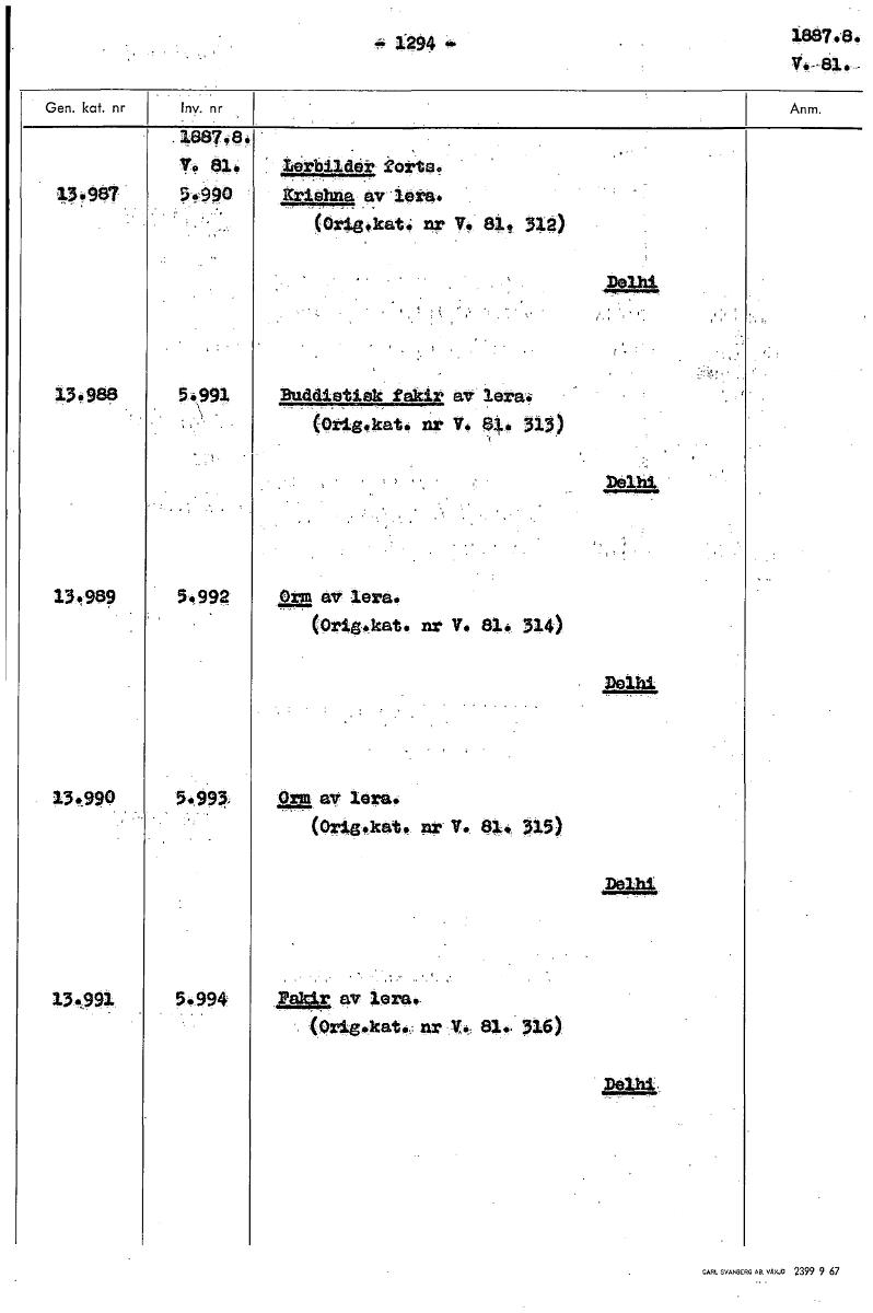 1.294 1887.$* v.-81.- .18874*. ,T4 31." Urbilder kotte. 154417 ,5490 icriehna av lera. (Ortaskat* Ar VT 81* 312) Delhk 13480 5.991 Buddietiek fakir av lera. (Otigokat. nr V. 818 313) Delhi • 1.989 5.992 Orm ev lera* (Orig*kat. nr V* 83.* 314) 13.990 5.9n tra. aV lera. Ve 81., 315: Delhi, 13.991 .994 Pagr a, 1ara., (Oriekkat.., 81.. 316) P.A1 [ocr]