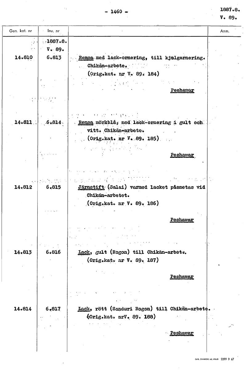 - 1460 1887.8. V. 89. 1887.8. V. 89. 14.810 6,813 Remsa, med lack-ornering, till kjalgalmering. Ch3kån-arbete0 (9rigikkato•nr V. 894 184) Peehawar ' . 14.811 6 814 Remsa, mörkblåti med' lack'-'ornerir...