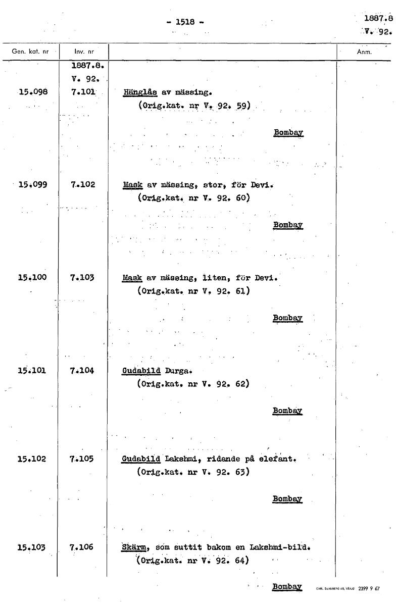 - 1518 - 1887.8. V. 15.098 7.101 . Hänglås av mässing. (Orig.kat. nr V., :92, 59) Bombay 15.099 7.102 Mask av mässing, stort kör Movi. (Orig.kat. nr V. 92.60) BömbAY. 15.100 7.103 Mask av mässing, liten, för Devi. (Orig.kat. nr V. 92. 61) Homba.v, 7 . 104 Gudabild Durga. (Orig.kat. nr V. 92. 62) Bombwir, 15.102 7.105 Gudabild Lakshmi, ridande på elekånte (Orig.kat. nr V. 92. 63) Bombay 15.103 7..106 Skärm, söm suttit bakom en LakehMibild. '(orig.kat. nrV492. 64) Bombay [ocr]