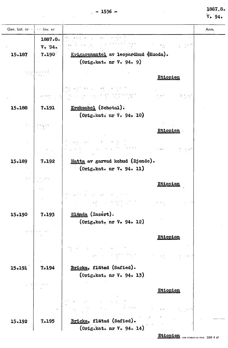 1536 1887.8. 94. 1887.8. 15.187 7.190 KriRaremantel av leopardhud 4Kuoda). (Orig,kat. nr V. 94. 9) Etiopien 15.188 7191 Kroksabel (Schotal); (Orig.kat. nr V. 94.10) Etiopien 15.189 74192 Matta.av garv...
