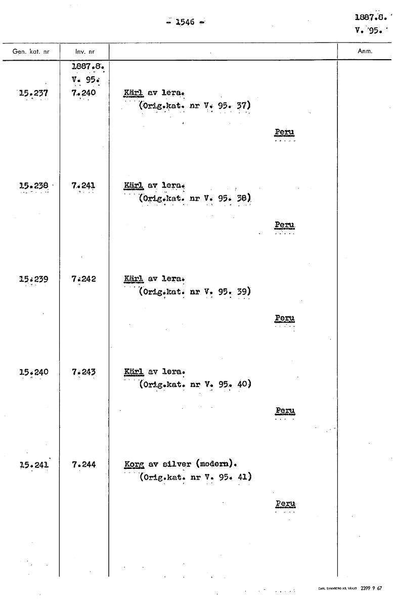 • 1887:8. ' ° 1546 V. '95. 1887.8. V. 95 15.237 7.240 Kärl av lera. (Orig.kat. nr V. 95. 37) Peru. 15.238' 7.241 Kärl av lera. (örtg.kat. nr V. 95. 30 Peru 15239 7.242 Kärl av lera. (Orig.kat. nr V. 95.... Visa hela