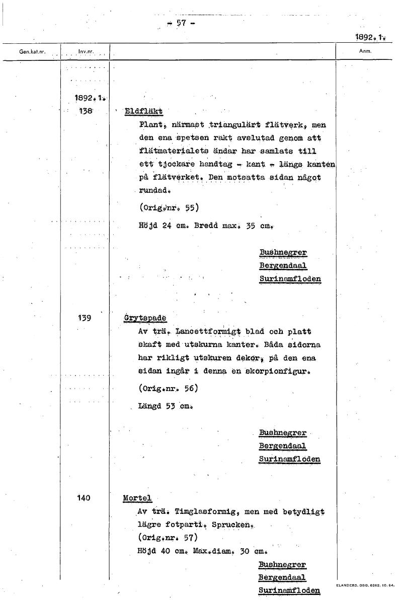 18921- 1892* 13a Eldfläkt Plant, närmaPt triangulärt flätverico men den ena :Spetsen rakt avslutad genom att flätmaterialetsändar har samlats till ett tjockare handtag - kant längs kanten på flätverket. Den motsatta sidan något rundad. (0rigrit0 55) Höjd 24 om. Bredd max,> 35 em, Buahnegter Bergendaal Surinamfloden . , 139 Grytspade Av trä*. LaneettforMigt blad och platt Skaft med utskurna kanter. Båda Sidorna har rikligt utskuren dekOr-, på den ena sidan ingår i denna en skorpionfigUt. (Origsnr. 56) Längd 53 Sm. BUshnegrer Bergendaal Surinamfloden 140 Mortel Av trä. Timglasformig, men med betY4igt lägre fotparti. Sprucken*. (Orig.nr. 57) Höjd 40 cm* Maxotiam* 30 om. Bushnegrer Bergendaal Surinaåfloden [ocr]Stäng