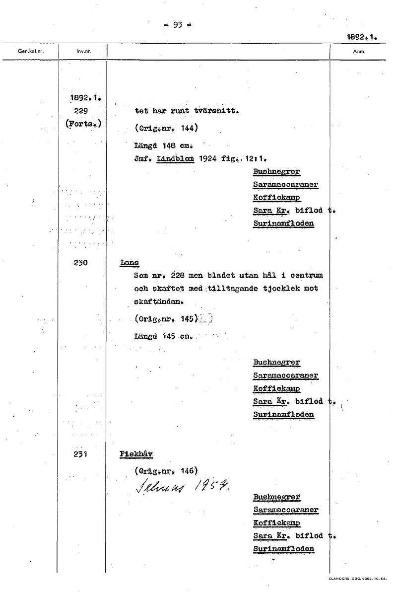 93 1892. 1. 229 tet har runt t*tfl'ailitt•. (yPorte«) (Origi,yrirf, 144) Längd 146 cm. auf: Lindblom 1924 fig., 12:1. Buehnegrer Saramaccaraner Koffiekemp SaxaAte biflod Surinamfloden 230 Lans Som nr,...Visa hela