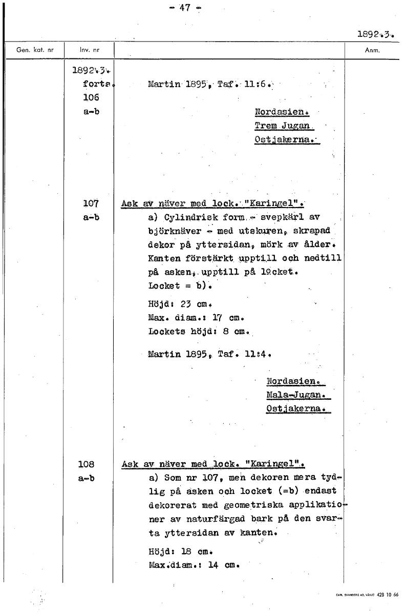 .° 47 1892'.34, forts Martin 18959 Taf, 11:6., 106 a-b Nordasien. Trem Jusan ostjakerna.- 107 Ask av näver med lock.'"Karingel". a-b a) Cylindrisk form - svepkärl av björknäver - med utskuren® skrapad dekor på yttersidan!) mörk av ålder. Kanten förstärkt upptill och nedtill på asken, upptill på 1.9.cket. Locket = b). Höjd: 23 cm. Max. diam.: 17 cm. Lookets höjd: 8 cm. Martin 18959 Taf. 11:4. Nordasien. Mala"JuRan. OstJakerna. 108 Ask av näver med lock. "Raringar. a-b a) Som nr 107, men dekoren mera tyd- lig på asken och locket (=b) endast dekorerat med geometriska applikatio ner av naturfärgad bark på den svar- ta yttersidan av kanten. Höjd: 18 0m. Max:diaft.; 14 cm. [ocr]Stäng