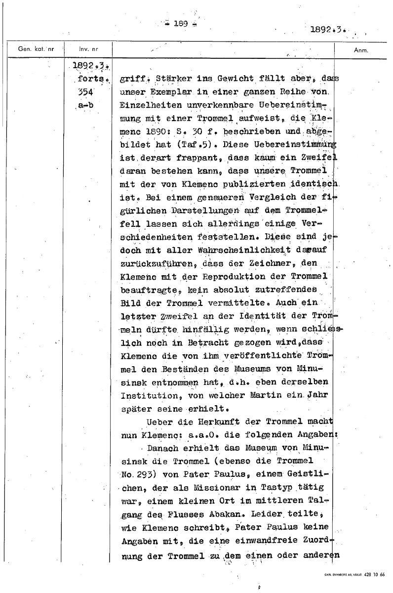 189 •,;! • 1892.3. 2,89295y i'orteg!.. griff. Stärker ins Gewicht fällt aber, d 554' unser Exemplar in einer ganzen Reih(5even. Einzelheiten unverkennbare UebereinetiM- Tung mit einer Trommel aufweist„ die Ile- , . mene 1890: S. 30 f. beschrieben und.abge- . bildet hat (Tafe5). Diese Uebereinstimid ist.derert frappant, dass kauM.ein Zweife dan bestehen karm, dass unsere Trommel mit der von Klemenc Publizierten identise ist. Bei einem genaueren Vergleich der fi girlichen Darstellungen, auf dem Tummel-= fell lassen °ich alletdings"einige Ver- schiåenheiten feststellen. Diege sind je doch mit allor Wahrecheinlichkeit darauf zurtickzufthren, dess der Zeichner„ den Klemene mit der Reproduktion der Trommel beauftragte, kein absolut zutreffendes. Bild der Trommel vermittelte. Auch'eie letzter 7meifel an der Identität der Tro mein dtirfte hinfallig werden, wenn sehlie. lich noch in Betracht gezogen wird,dass Klemene die von ihmveröffentlichte Töm mel den Beständen des Museums von Minu- sinsk entnommen hat, d.h. eben derselben Institution, von welcher Martin ein. Jahr später seine erhielt. Ueber die Herkunft der Trommel mach nun Klemenc: a.a.0. die folgenden Angabe • Danach erhielt das Museum von Minn- sinsk die Trommel (ebenso die Trommel No.293) von Pater Paulus, einem Geistli- ,chen, der als Missioner in Tastyp,tätig war, einem kleinen Ort im mittleren Tele. gang deg Plusses Abakan. Leider, teilte, wie Klemene schreibt, Pater Paulus keine Angaben mit, die eine einwandfreie Zuord nung der Trommel zu ,dem enen oder ander n [ocr]