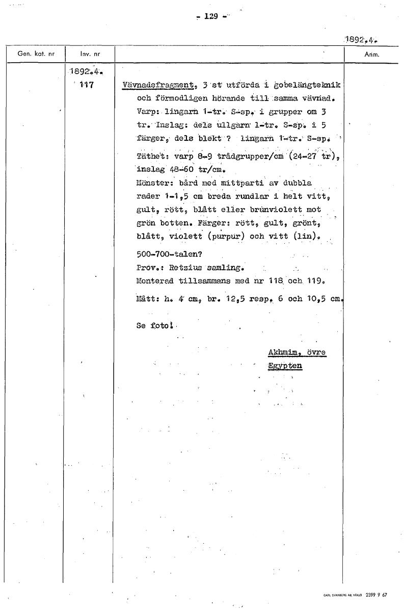 1.'29 - 1892.4.. 1892.4, 117 Vävnadsfra.qment, 3 st utförda i gobelängteknik och förmodligen hörande till samma vävnad. Varp: lingarn 1-tr„ S-sp. i grupper om 3 tr. Inslag: dels ullgarn 1-tr. S-sp, i 5 färger, dels blekt ? lingarn r-tr. S-sp. Täthet: varp 8-9 trådgrupper/cm (24 2i tr), inslag 48-60 tr/cm, Mönster: bård med mittparti av dubbla rader 1-1,5 cm breda rundlar i helt vitt, gult, rött, blått eller brUnviolett mot grön botten. Färger: rött, gult, grönt, blått, violett (purpur) och vitt (lin), 500-700-talen? Prov,: Retzius samling, Monterad tillsammans med nr 1'i8 och 119. Mått: h. 4 cm, br. 12,5 resp. 6 och 10,5 cm Se foto å . Akhmim, övre EgYb ten [ocr]