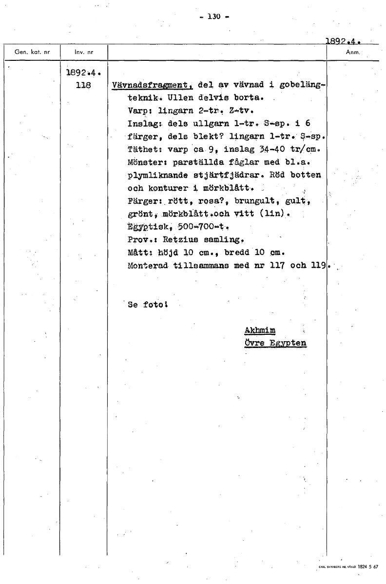 — 130 — 18(32.4. 1892.4. 118 Vävnadsfragment del av vävnad i gobeläng- teknik. Ullen delvis borta. , Varp: lingarn 2-tr. Z-tv. Inslag:, dels ullgarn 1-tr. S- p. i 6 färger, dels blekt? lingarn 1-tr. S...