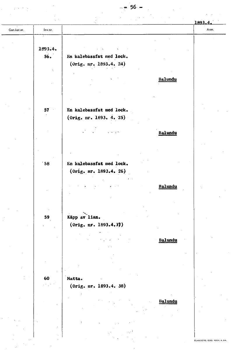 • - 56 1893.4.. 1893.4. 56.' En kalebåssfat med lock. (Orig. nr. 1893.4. 24) 8a 57 En kalebassfat med lock. (Orig. nr.. 1893. Balundu '58 En kalebasSfat med lock. Orig. nr. 1893.4. 26) Balundu 59 Käpp a... Visa hela