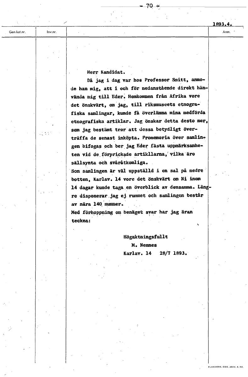 • 1893.4. Herr Kandidat. Då jag i dag var hos Professor Smitt, anmo- da han mig, att i och för nedanstående direkt hän- vända mig till Eder. Hemkommen från Afrika vore det önskvärt, om jag, till riksmus... Visa hela