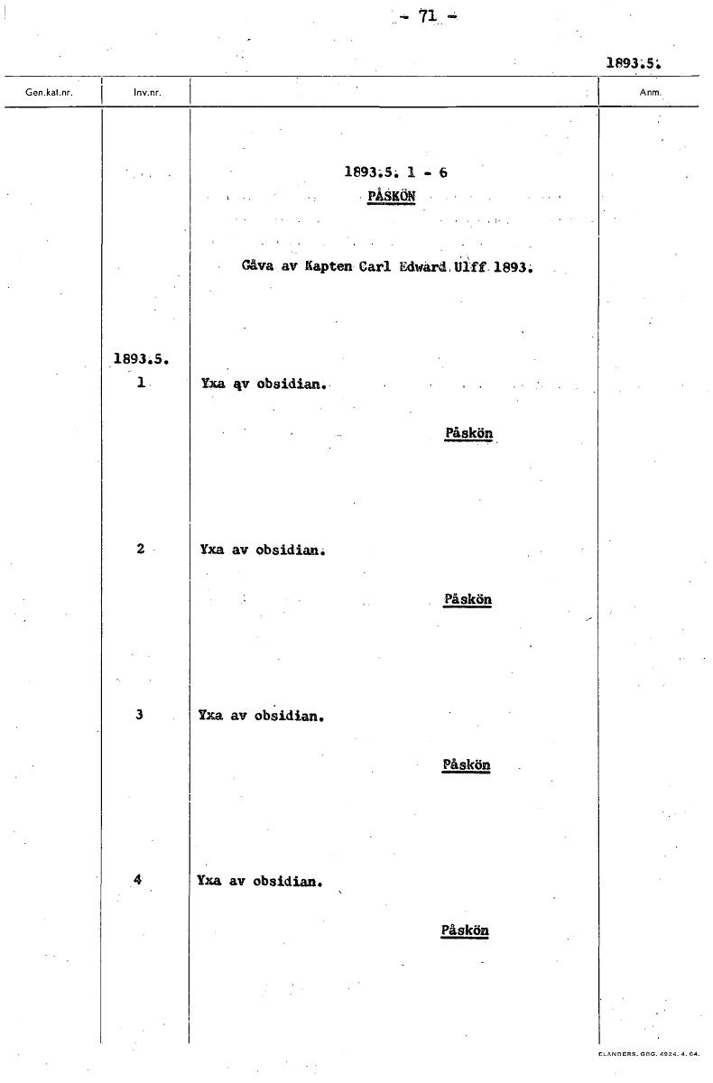 • --- 71 ‘ 1893:51 1893:5: 1 - 6 PÅSKÖN Gåva., av Kapten Carl Edward, tilft. 1893: 1893.5. 1 Yxa av obsidian. Påskön 2 Yxa av obsidian. Påskön 3 Yxa av obsidian. Påskön Yxa av obsidian. Påskön [ocr]