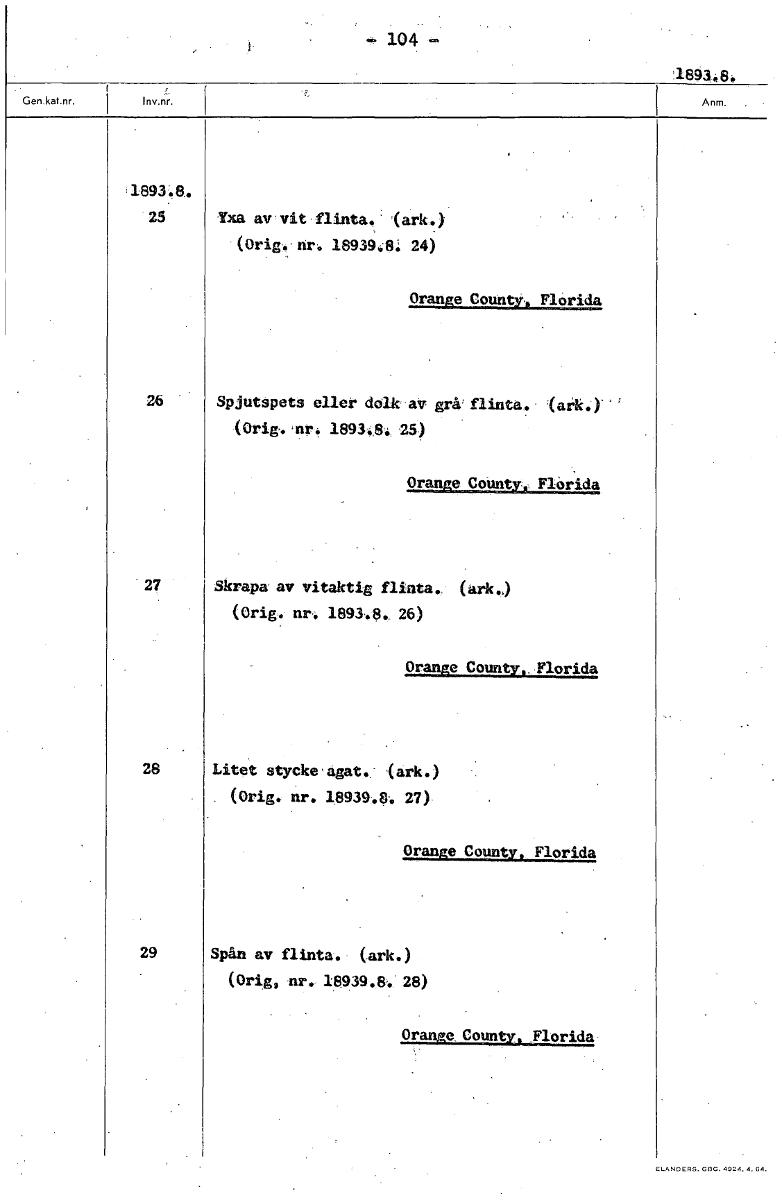 • - 104 - 1893.8.. 25. Yxa av.vit flinta. (ark.) (Orig. nr. 18939.8. 24) Orange CountY„ Florida Spjutspets eller dolk -av grkflinta. azi*.Y (Orig.'nr, 1893,84 25) Orange CoUnty, Florida 27 Skrapa av vit... Visa hela