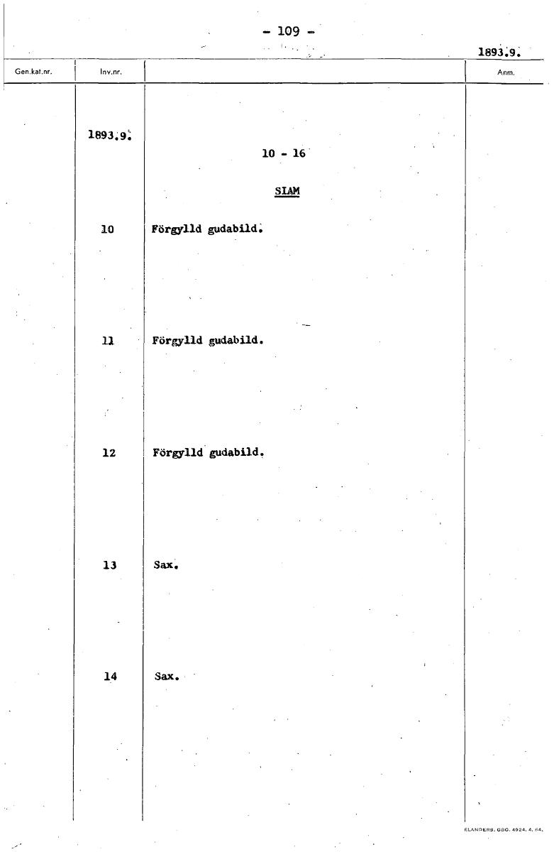 • -109 1893:9. 1893:9: 10-16 SIAM 10 Förgylld gudabild. Förgylld gudabild. 12 Förgylld gudabild. 13 Sax, 14 Sax. [ocr]