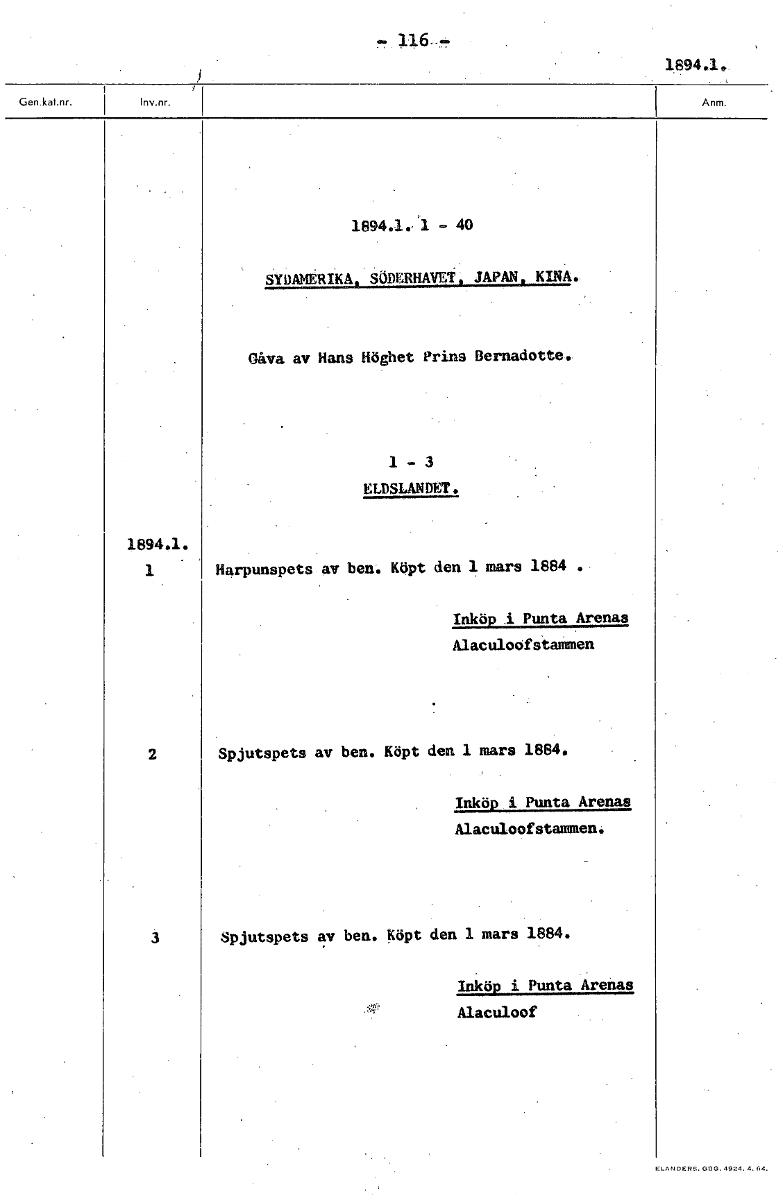 • 1894.1. 1894.1:1 - 40 SYDAMERIKA SÖDERHAVET JAPAN KINA. Gåva av Hans Höghet Prins Bernadotte. 1 - 3 ELDSLANDET. 1894.1. 1 Harpunspets av ben. Köpt den 1 mars 1884 .- Inköp I Punta Arenas AlaculoastaMm... Visa hela