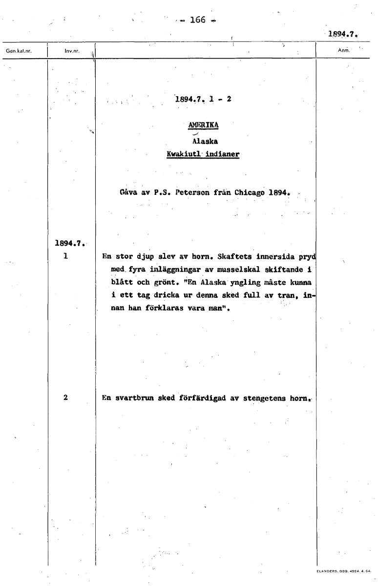 • 166 1894.7. 1894.7. 1 - 2 AMERIKA Alaska Kwakiutl indianer Gåva av P.S. Peterson från Chicago 1894. 1894.7. 1 En stor djup slev av horn. Skaftets innersida pry' med, fyra inläggningar av musselskal sk... Visa hela