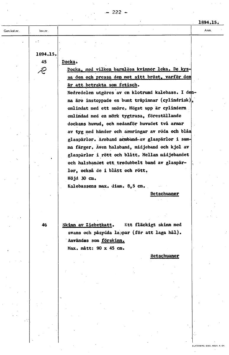 - 222 . 1894.15. 1894.15, 45 Docka. Docka. med vilken barnlösa kvinnor leka. De kys- sa den och pressa den mot sitt bröst varför de är att betrakta som fetisch. Nedredelen utgöres-av en klotrund kaleb...