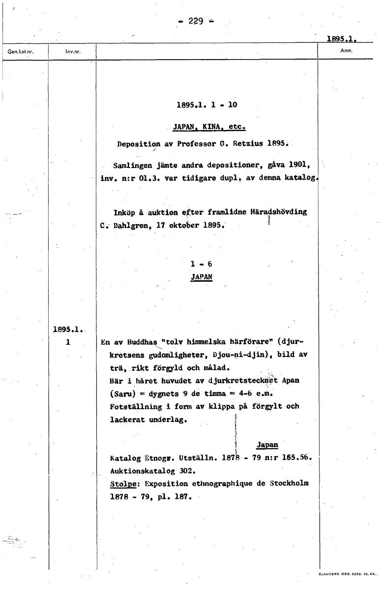 229 1895.1. 1895.1. 1 - 10 JAPAN, KINA, etc. Deposition av Professor 0. Retzius 1895. Samlingen jämte andra depositioner, gåva 1901, inv. n:r 01.3. var tidigare dupl. av denna katalog Inköp å auktion ...