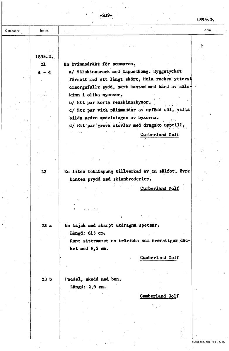 -239- 1895.2.. 21 En kvinnodräkt för sommaren. a - d a/ Sälskinnsrock sed kapuschong. Ryggstycket försett med ett längt skört. Hela rocken ytters omsorgsfullt sydd, samt kantad med bård av säls kinn i olika nyanser. b/ Ett par korta renskinnsbyxor. c/ Ett par vita pälsmuddar av nyfödd säl, vilka bilda nedre avdelningen av byxorna. d/ Ett par grova stövlar med dragsko upptill. Cumberland Golf 22 En liten tobakspung tillverkad av en sälfot, övre kanten prydd med skinnbroderier. Cumberland Golf 23 a En kajak med skarpt utdragna spetsar. Längd: 613 cm. Runt.sittrummet en träribba som överstiger.däc- ket med 845 cm. Cumberland Golf 23 b Paddel, skodd med ben. Längd t 2,9 cm. Cumberland Golf [ocr]Stäng
