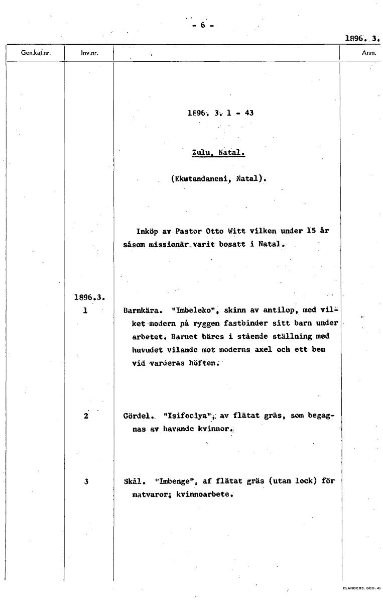 1896. 3. Anm. 1896: 1 - 43 Zulu, Natal. (Ekutandaneni Natal . Inköp av Pastor Otto Witt vilken under 15 år såsom missionär varit bosatt i Natal. 1896.3. 1 • Barnkära. "Imbeleko", skinn av antilop, med...