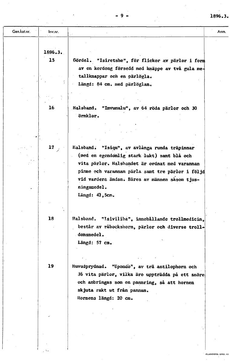 • - g - 1896.3. Gen.kat.nr. Anm. 1896.3. 15 Gördel., "Isiretshe", för flickor av,pärlor i fo av en kordong försedd med knäppe av två gula me tallknappar och en pärlögla. Längd: 84 cm. med pärlöglarG 16 ... Visa hela