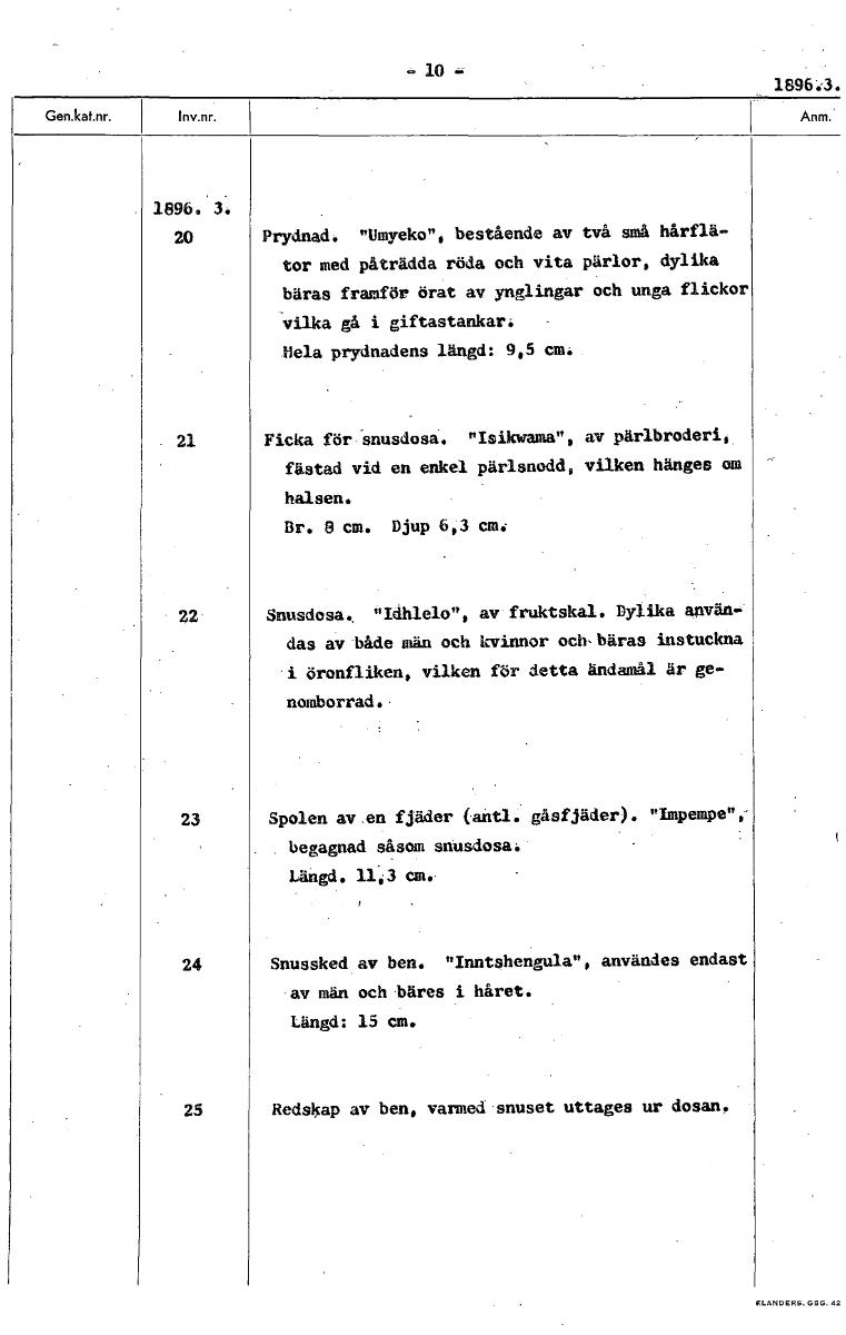 10 1896:3. 1896. 20 Prydnad. "Umyeko", bestående av två små hårflä- tor med påträdda röda och vita pärlor, dylika bäras framför örat av ynglingar och unga flickor vilka gå i giftastankar. Hela prydnad...