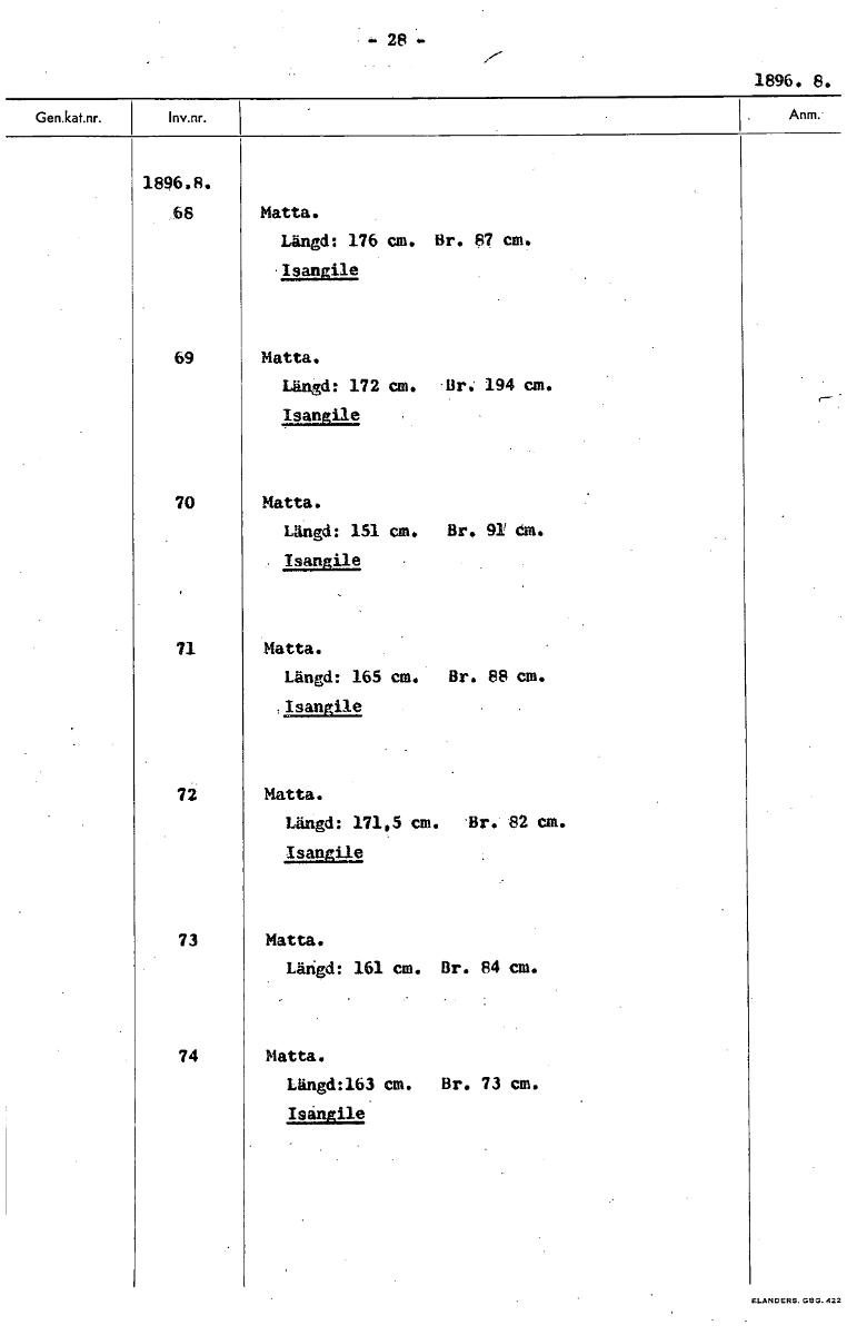 • -28- 1896. 8. 1896.8. 68 Matta. Längd: 176 cm. Br. 87 cm. Isangi1e 69 Matta. Längd: 172 cm. Br. 194 cm. Isangile 70 Matta. Längd: 151 cm. Br. 91 dm. Isangile n Matta. Längd: 165 cm. Br. 88 cm. ,Isangl... Visa hela