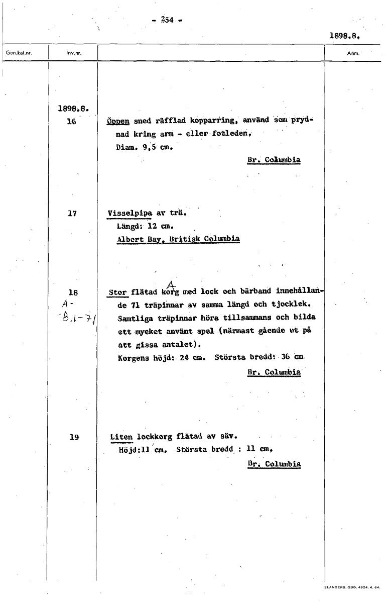 - 254 1898.8. 1898.8. 16» öppen sned räfflad kopparting, använd sam pryd- nad kring arm - eller fotleden. Diam. 9,5 cm. Br: Columbia Visselpipa av trä. Längd: 12 cm. Albert Bay, Britisk Columbia A- Stor flätad korg med lock och bärband innehållan- de 71 träpinnar av samma längd och tjocklek. Samtliga träpinnar höra tillsammans och bilda ett mycket använt spel (närmast gående ut på att gissa antalet). Korgens höjd: 24 cm. Största bredd: 36 au Br. Columbia Liten lockkorg flätad av säv. Höjd:11 cm. Största bredd : 11 an. Br. Columbia [ocr]Stäng