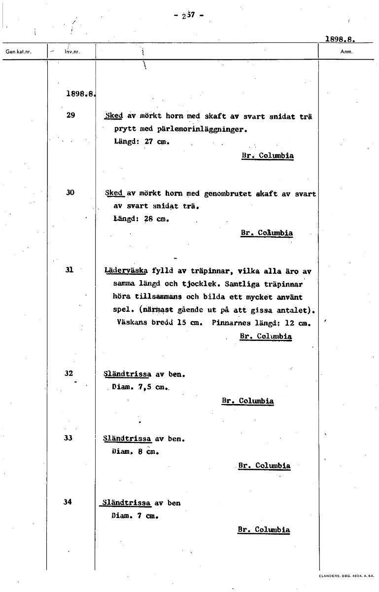1898.8. 1898,8 29 Sked av mörkt horn med skaft av svart snidat trä prytt med pärlemorinläggninger. Längd: 27 cm. Br, Columbia 30 Sked av mörkt horn med genombrutet akaft av svart av svart snidat trä. Längd: 28 cm. 8r. Columbia 31 Läderväska fylld av träpinnar, vilka alla äro av samma längd och tjocklek. Samtliga träpinnar' höra tillsammans och bilda ett mycket använt spel. (närmast gående ut på att gissa antalet). Väskans bredd 15 am. Pinnarnes längd: 12 cm. Br. Columbia 32 Sländtrissa av ben. Diam. 7,5 an., Br. Columbia 33 Sländtrissa av ben. Diam, 8 cm. .8r. Columbia • 34 Sländtrissa av ben Diam. 7 cm. Br. Columbia [ocr]Stäng