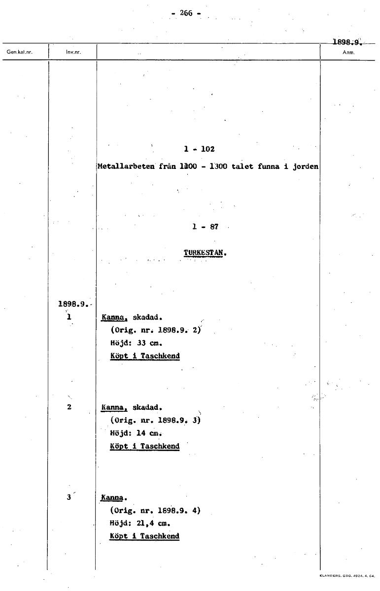 • -266- 1898' 1-102 Metallarbeten från 1100 - 1300 talet funna i jorden 1 - 87 TURKESTAN. 1898.9.- 1 11~42 skadad. (Orig. nr. /898.9. 2Y Hojd: 33 cm. Köpt i Taschkend 2 Kanna skadad. (Orig. nr. 1898.9. ... Visa hela