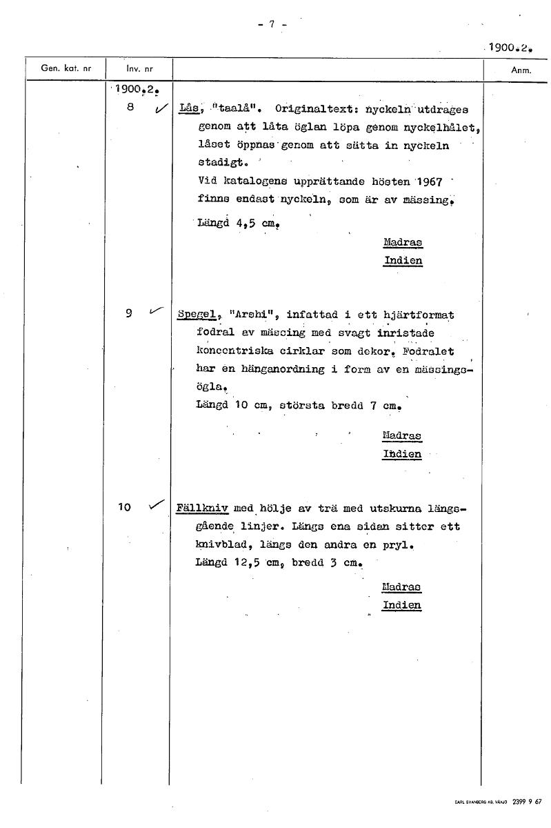 — 7 — .10 Lås; fttaalån. OriginalteXt: nyckeln-utdrages genom att låta öglan löpa genom nyckelhålet, låset öppnae'genom att sätta in nyckeln stadigt. Vid katalogen° upprättande hösten '1967 " finns en...