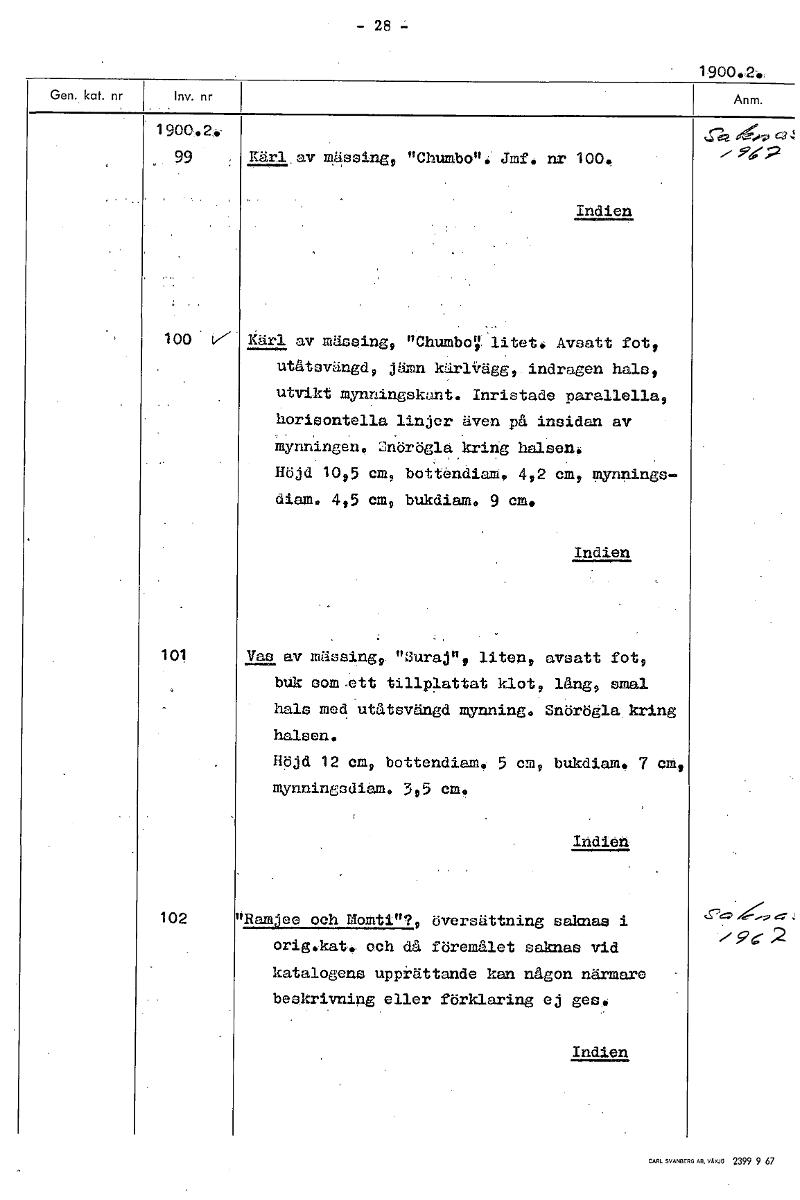 - 28 • 1900.2-4* 99 , Kärl av mässing, "Chumbon. Jmf. nr 100* Indien wo V Kärl av mässing, "ChumboV litet, Avsatt fot, utåtevängd, jämn kärlVägg, indragen hals, utvikt mynningskant. Inristade parallella, horisontella linjer även på insidan av mynningen, 2nörögla kring halsen. Höjd 1095 em, bot.tendiam. 4,2 em, mynnings- diam. 4,5 em, bukdiam, 9 em* Indien 101 Vas av mässing, "Slirar, liten, avsatt fot, buk nom ett tillplattat klot, lång, smal hals med utåtsvängd mynning. Snörögla kring halsen. Höjd 12 em, bottendiam. 5 em, bukdiam. 7 cm, mynningsdiam, 3,5 em. 102 "Ramee och Momti"?, översättning saknas i cr:=P 9 2 orig.kat, och då föremålet saknas vid katalogens upprättande kan någon närmare beskrivning eller förklaring ej ges* Indien [ocr]