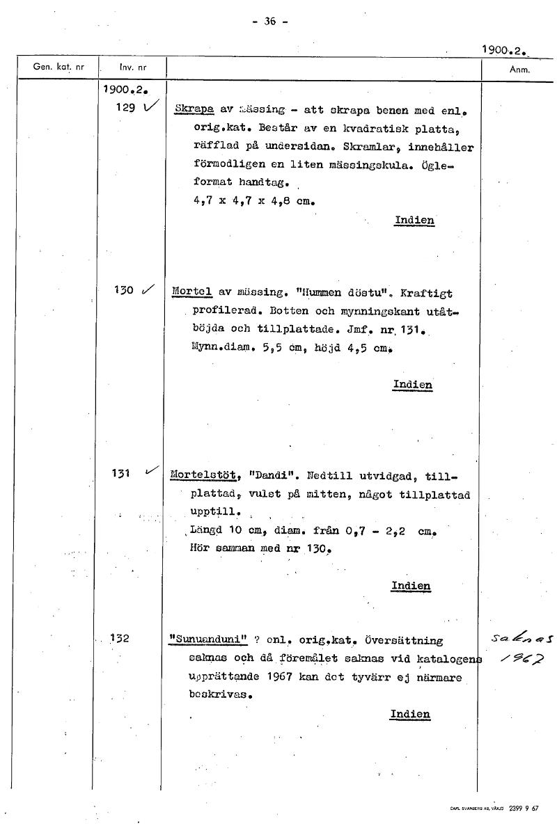 - 36 - 1900.2._ 1900.2. 129 av LAAssing - att skrapa benen med enl,. orig.kat. Består av en kvadratisk platta, räfflad på undersidan, Skrnmlar9 innehåller förmodligen en liten mässingskula. ögle- format handtag. , 4,7 x 4,7 x 4,8 cm. Indien' 130 i/ Mortel av mässing. "Hummen döstu". Kraftigt profilerad. Botten och mynningskant utåt- böjda och tillplattade. Jmf. nr, 131, Mynn.diam. 5,5 cm, höjd 4,5 cm. Indien 131 Mortelstöt, "Dandi". Nedtill utvidgad, till- plattad, vulst på mitten, något tillplattad upptill. , ,Längd 10 cm, diam. från 0,7 - 2 2 cm. Hör samman med nr 130. ---«--- Indien 132 "Sunuanduni" ? enl. origekat. Översättning saknas och då föremålet saknas vid katalogen upprättande 1967 kan det tyvärr ej närmare beskrivas. Indien [ocr]