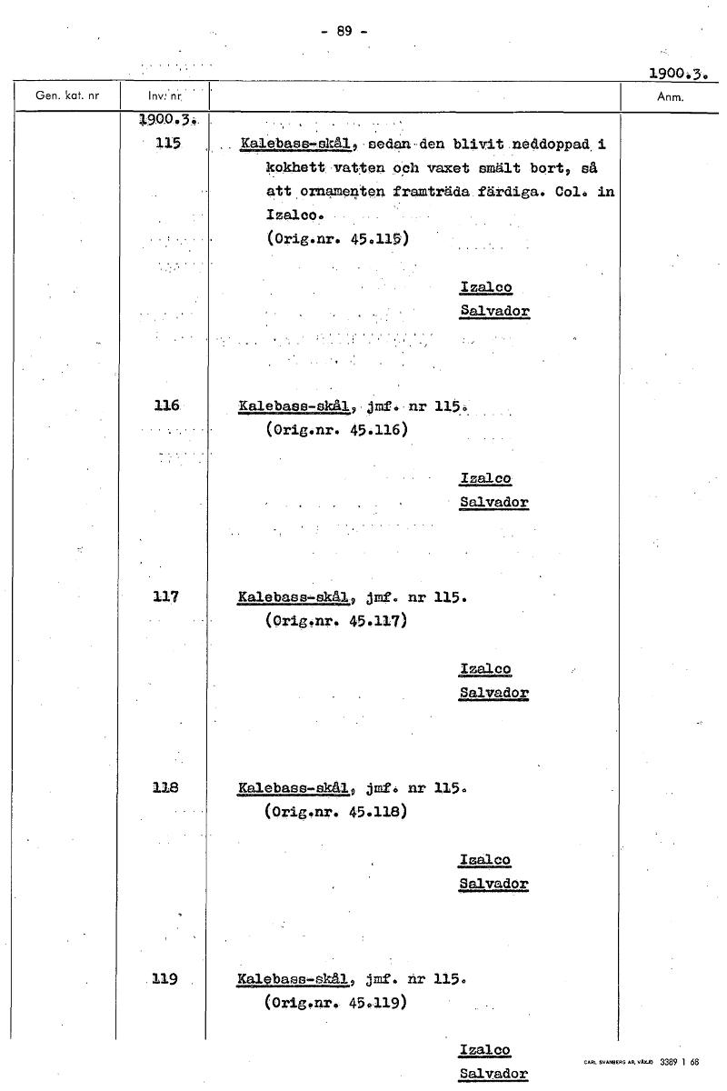 - 89 - 1900:3. 1900.3k 115 Kalebass-skål, sedan-den blivit neddoppad,i kokhett.vatten oph vaxet smält bort, så att,ornamenten framträda färdiga. Col. in Izalco. (Orig.nr. 45.115) Izalco Salvador 116. ...