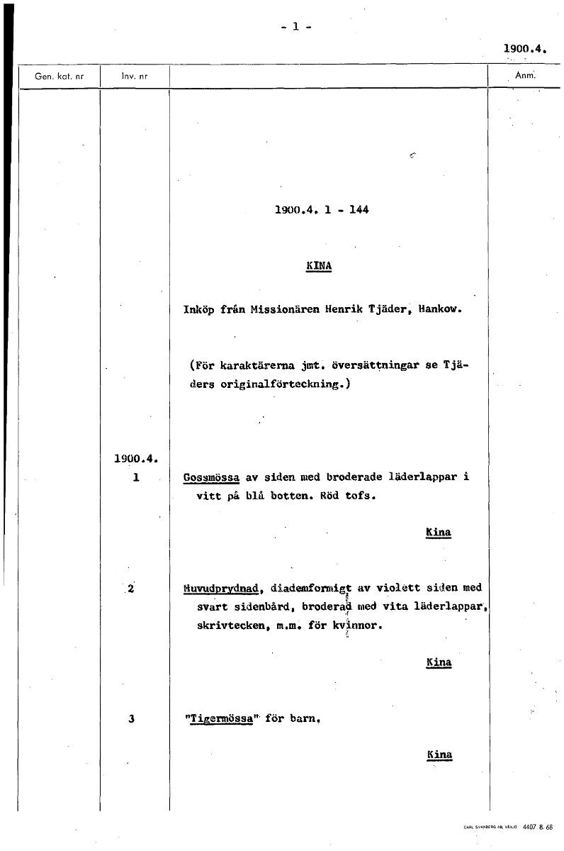 • 1 1900.4. 1900.4. 1 - 144 KINA Inköp från Missionären Henrik Tjäder, Hankow. (För karaktärerna jmt. översättningar se Tjä- ders originalförteckning.) 1900.4. 1 Gossmössa av siden med broderade läderla... Visa hela